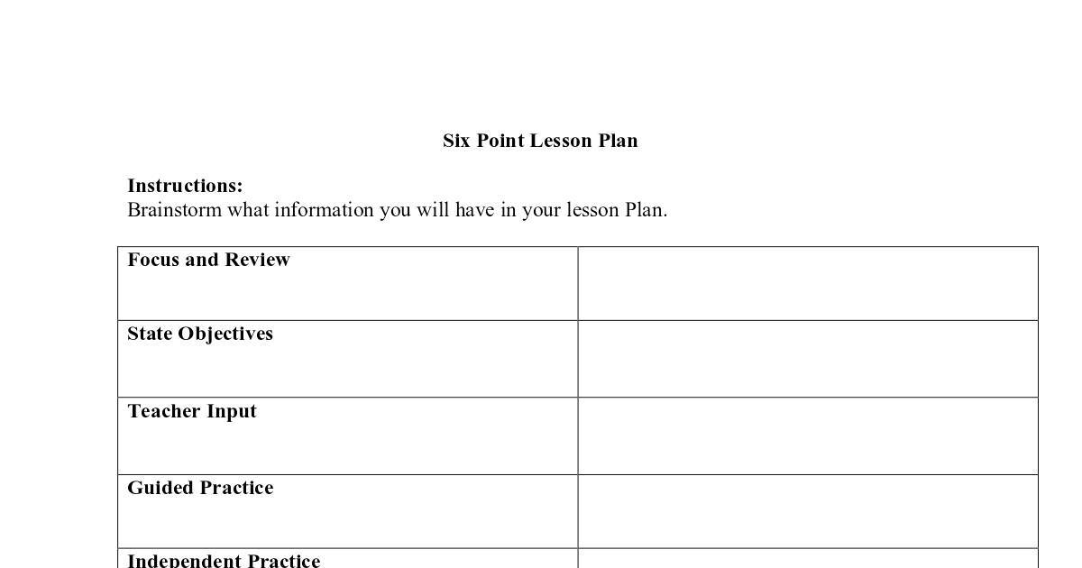 6 point lesson plan. 6 Point Lesson Plan - XpCourse 6 point lesson plan provides a comprehensive and comprehensive pathway for students to see progress after the end of each module. With a team of extremely dedicated and quality lecturers, 6 point lesson plan will not only be a place to share knowledge but also to help students get inspired to explore and discover many creative ideas from themselves.Clear and detailed training methods for each ... 6 Point Lesson Plan Template - Study.com One effective model for planning lessons is the 6-Point Lesson Plan template. Not familiar with this? This lesson explains the model's components and provides a sample for use in your planning and... Lesson Plans - Mrs. Bowling's Kindergarten Class VI. As a recap, as a whole group, examples will be given of cards and students can raise their hands to answer the correct CVC Materials and Time I. Phonic Song video which will last 2:53 minutes and ABC flashcards an additional 3 minutes II. Letter tiles and pictures will be provided for the lesson III. How To Write A Six Point Lesson Plan - cyle.balloondir.info It might How To Write A Six Point Lesson Plan seem impossible to you that all custom-written essays, research papers, speeches, book reviews, and other custom task completed by our writers are both of high quality and How To Write A Six Point Lesson Plan cheap. It is surprising, but we do have some tricks to lower prices without hindering quality.