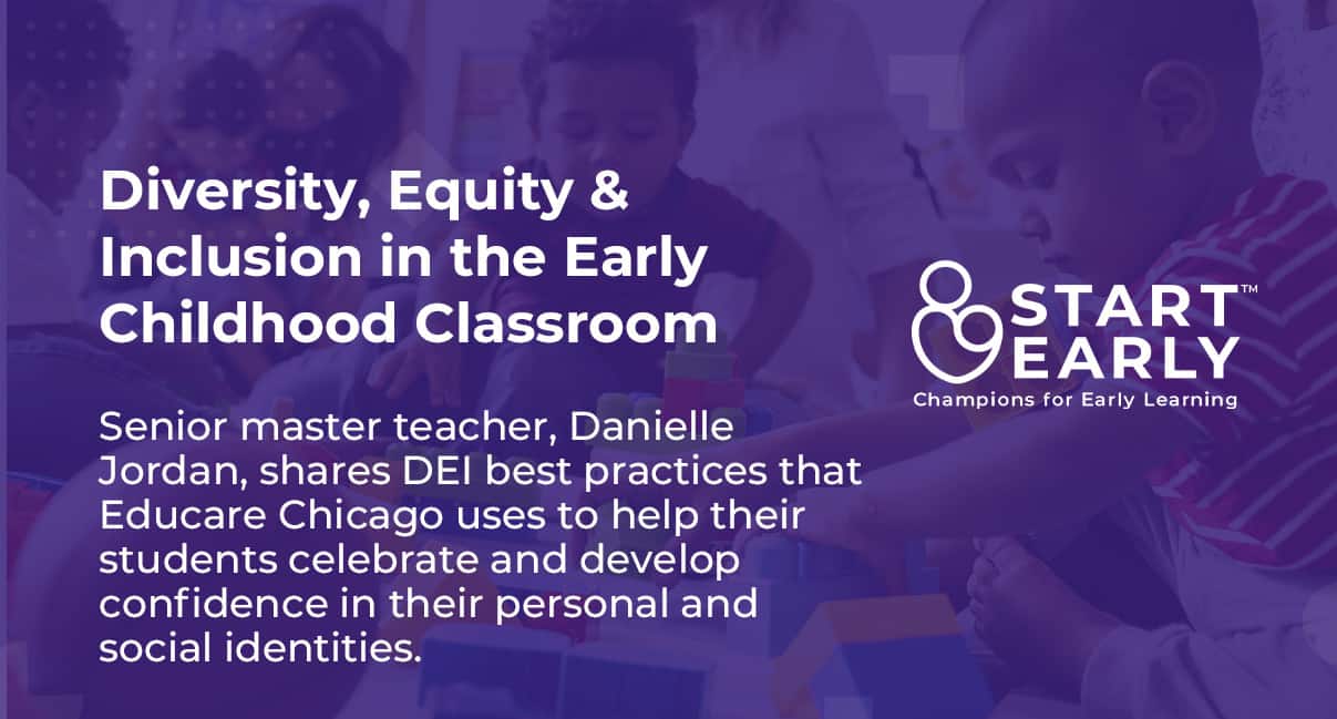 Diversity, Equity & Inclusion in the Early Childhood Classroom Diversity, Equity & Inclusion in the Early Childhood Classroom Senior master teacher, Danielle Jordan, shares DEI best practices that Educare Chicago uses to help their students celebrate and develop confidence in their personal and social identities. February 18, 2021 Early Learning and Care Equity Family Engagement Blog Video