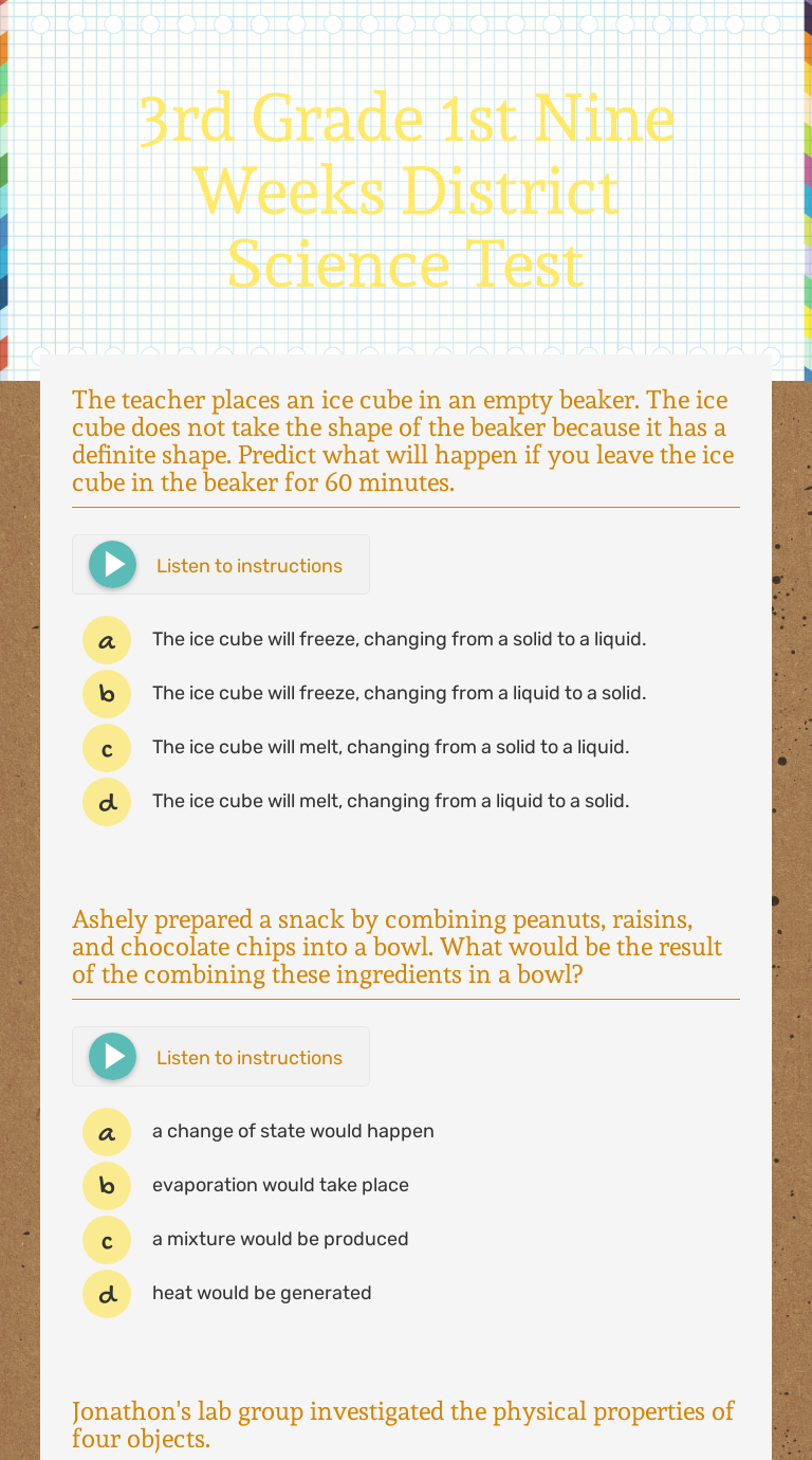 3rd grade science test. Abeka 3rd grade science test 2 study guide Questions and ... Start studying Abeka 3rd grade science test 2 study guide. Learn vocabulary, terms, and more with flashcards, games, and other study tools. Science Final Test (Grade 3) - Quizizz Play this game to review Science. Part of plant that transports water and mineral ... 7th - 8th grade. 0 times. Science ... Question 3. SURVEY. Ungraded. PDF End-of-the-Year Test - Grade 3 - Math Mammoth End-of-the-Year Test - Grade 3 This test is quite long, so I do not recommend having your child/student do it in one sitting. Break it into parts and administer them either on consecutive days, or perhaps on morning/evening/morning. This is to be used as a diagnostic test. 3rd Grade Trivia - Science Fun 3rd Grade Trivia Plant Power Test your knowledge in the "Plant Power" Quiz Motion Commotion Test your knowledge in the "Motion Commotion" Quiz A Matter of Science Test your knowledge in the "A Matter of Science" Quiz