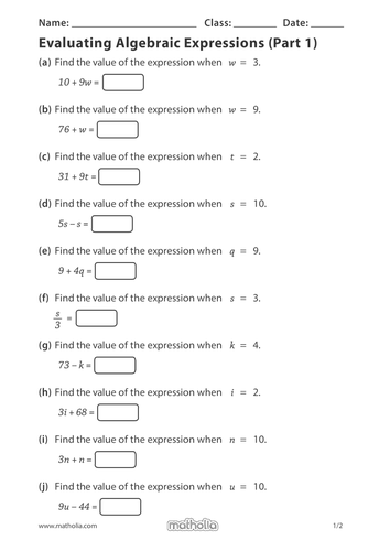 Free worksheets for evaluating expressions with variables ... With this worksheet generator, you can make printable worksheets for evaluating simple variable expressions, when the value of the variable (s) is given. There are three levels, the first level only including one operation. For example, the student might find the value of the expression 2 ( t − 5), when t has the value -6.