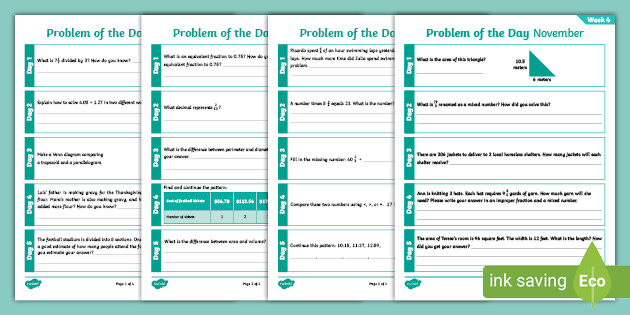Problems of the Week - National Council of Teachers of ... A Day in the Park Use a rectangular coordinate map of the recreation area to answer various questions. 3rd to 5th, 6th to 8th A Deviation from the Average Students create data sets with a given mean and standard deviation. Discrete Math High School A Dicey Situation 5th Grade: Math Problems of the Day - Blogger 5th Grade Home; Mrs. Gunnin ; Mrs. Hutter; Math Problems of the Day ; Mountain Math; Digital Learning; ShowMe Videos; Summer Math (optional) Civil War "letters from Home" links; Math Problems of the Day Home. Subscribe to: Posts (Atom) Total Pageviews. Blog Archive 2019 (7)