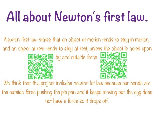 Science Experiment: Newton's First Law of Motion Today we are going to look at Newton's First Law of Motion called Inertia. This law states that a still object will stay still unless a force pushes or pulls it. A moving object will stay moving unless a force pushes or pulls it. Gravity and friction are forces that constantly push and pull the "stuff" on earth.