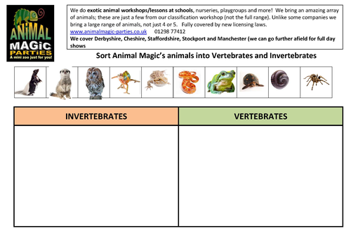 Vertebrate and invertebrate - Teaching resources High school KS4 Y9 Y10 Y11 Health and Social Care. VERTEBRATE AND INVERTEBRATE ANIMALS Maze chase. by Sharifahhazwani. Vertebrate and Invertebrates - Ballon Pop Balloon pop. by Guetita2. 6-7 AÑOS Invertebrates and Vertebrates SCIENCE. Sectors and services Match up. by Clarejenkins72. Y10 Health and Social Care. FREE Easy and Engaging Vertebrate Activity (Animal Sort) First, print off the pages. Next, cut out the animals. Here are where the options come in. You can make this an activity to do over and over by laminating the pictures and placing magnets on the animals and the empty spaces on the major groups of animal sheets. Or you can make it a one time sort, and provide glue and scissors. Magnefic!