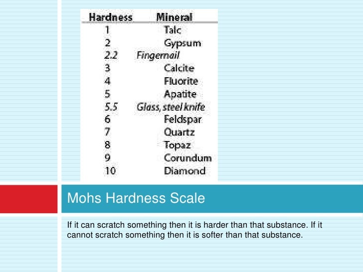 List of mineral tests - Wikipedia The Mohs Hardness Scale is the main scale to measure mineral hardness. Finger nail is 2.5, copper coin is 3.5, glass is 5.5 and steel is 6.5. Hardness scale is Talc is 1, Gypsum is 2, Calcite is 3, Fluorite is 4, Apatite is 5, Orthoclase Feldspar is 6, Quartz is 7, Topaz is 8, Corundum is 9 and Diamond is 10. Odor. Mineral Identification Quiz | Earth Sciences Quiz - Quizizz Rub the mineral on a porcelain tile and observe the color of the material left behind. Carefully measure the mass of the sample of the unkown mineral. Place the mineral in boiling water in order to identify its boiling point. Compare the size of a mineral to the size of a known identity of another mineral. Q.