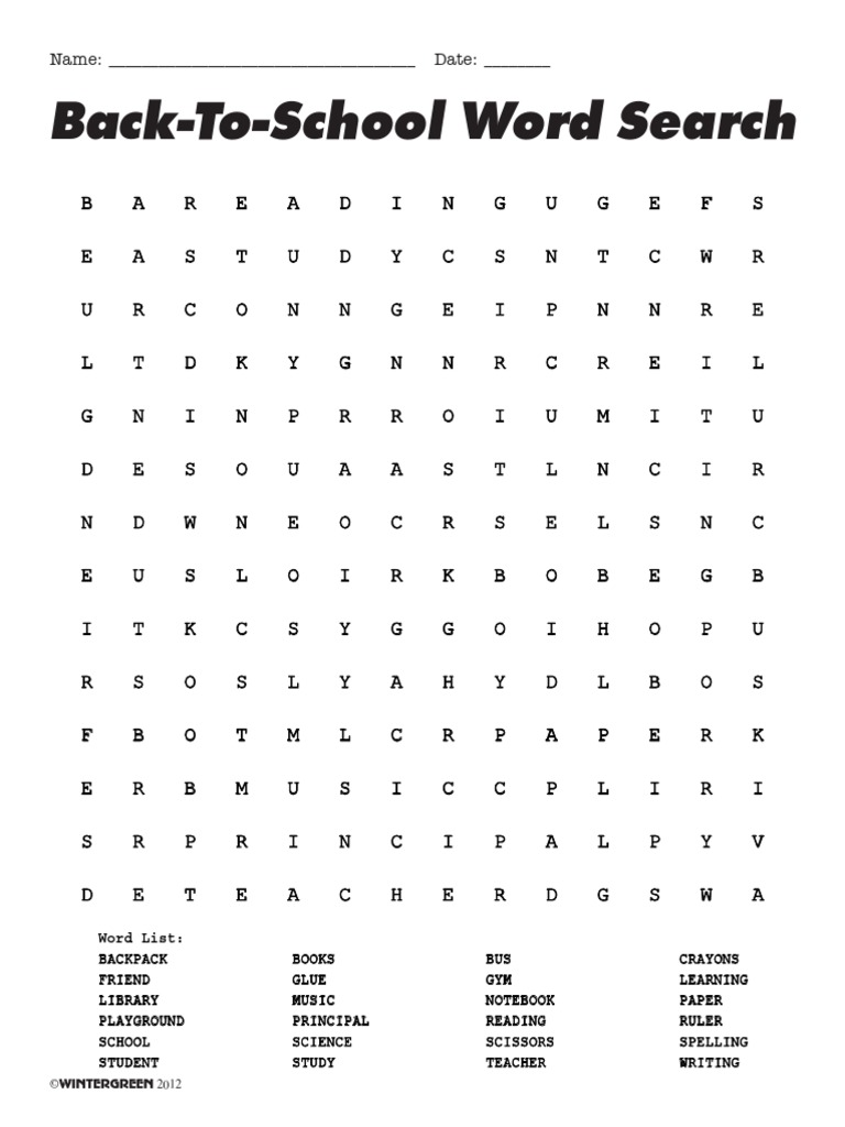 Back To School Word Search Puzzles For Kids - Tree Valley Academy This back to school word search is ideal for a student in third grade. The words of the puzzle are from these grade 3 themed spelling words. The 12 words are hidden vertically, horizontally, and diagonally. There are no backwards words and all of the words are in the direction easiest to read.