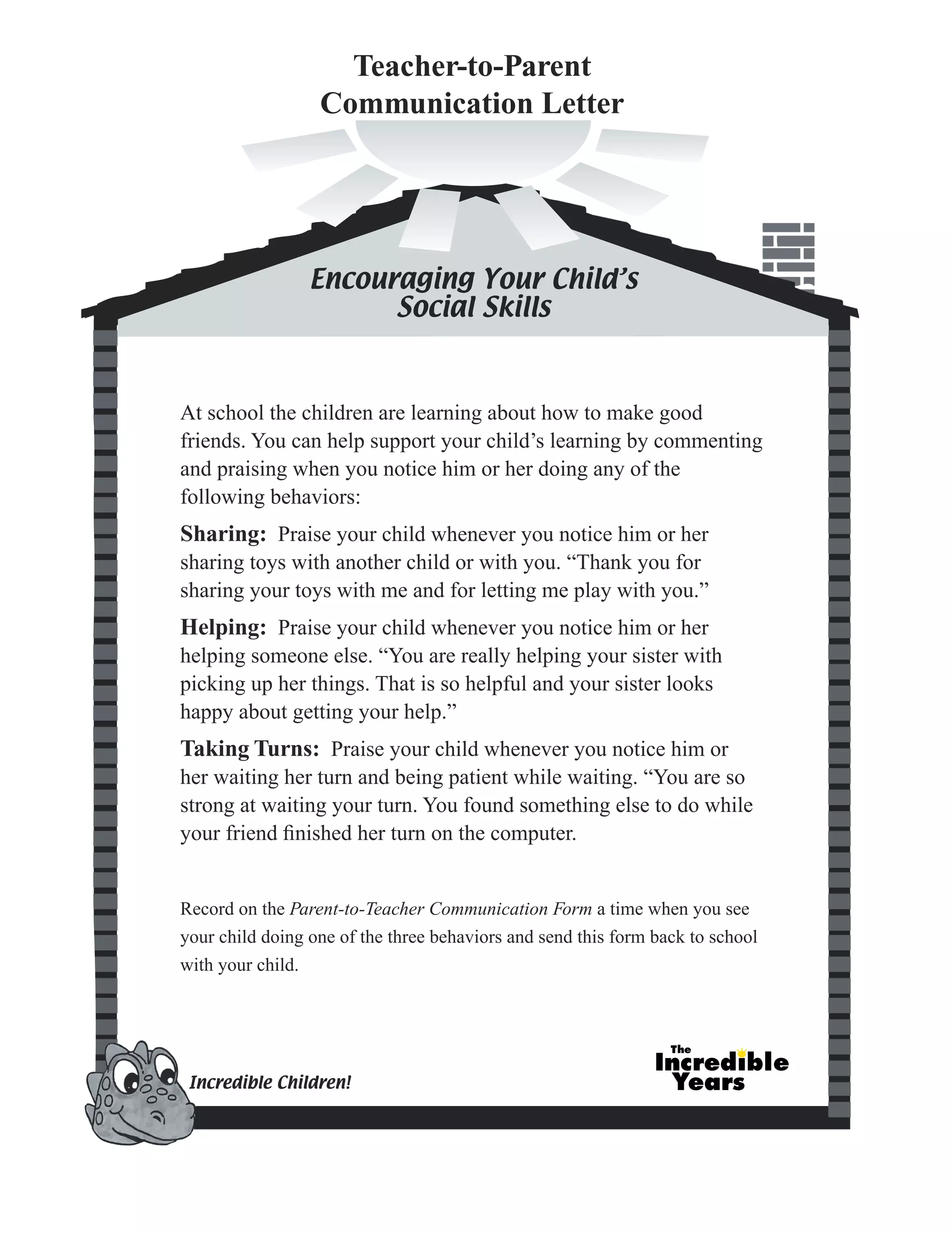 Event: Positive Behavior Strategies for Parents, Caregivers & Teachers In person and virtual event for parents, caregivers, and teachers about how to respond and react to the most common behaviors exhibited by children with socially-distracting or undesirable forms ... Parent-teacher communication templates | Education World Parent-teacher communication templates Communicate with parents by snail mail or e-mail with these editable and/or printable forms and letters. Conference planner template: Parental concern checklist Conference planner and record template: Teacher version Conference reminder and teacher-to-parent questionnaire template 10 steps to constructive parent-teacher communication - Learn 04. Set expectations with a course syllabus. At the start of the term, create and send out a course syllabus to parents as well as students so that everyone knows what to expect. Send it to parents in an email so that they can refer to it any time throughout the term if they have questions. Paper copies tend to get lost. How Two-Way Communication Can Boost Parent Engagement And, with time and persistence, communication can grow into strong parent-teacher relationships. Try these tips for building two-way communication into your parent partnership plan: Discuss contact methods with each parent at the beginning of the school year. Use their preferences to create personal and classroom parent communication plans.