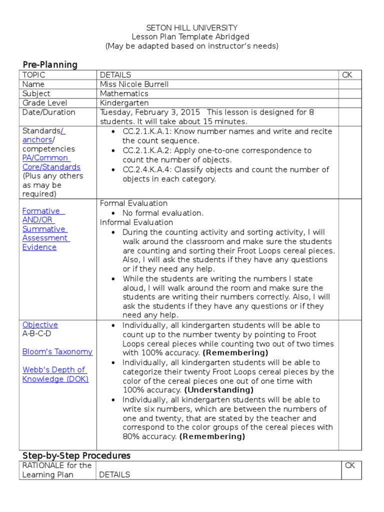 Kindergarten Math Counting Lesson Plan - K6edu.com Kindergarten Math Counting Lesson Plan · 1. Pretest · 2. Read the class a counting book. · 3. Tell the class they are going to be working on the numbers 1,2,3,4, ...