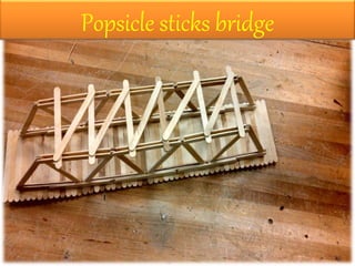 Popsicle Stick Bridge : 9 Steps (with Pictures) - Instructables I built a bridge out of Popsicle sticks. It is about eighteen inches long and five and a half inches high. I made it for a 7th grade class extension project. It has to be at least 18 inches long. There was no height limits and has to hold one hundred pounds. For your bridge to hold one hundred pounds you must do a lot of research first. Popsicle Stick Bridge Examples Jan 16, 2006 · The 100 stick popsicle bridge challenge is on. This Howe Truss bridge uses 99 popsicle sticks, spans 21 inches, and holds 200+ pounds. It’s efficiency score is 678. This is an updated version of my old “Popsicle Bridge #3” which was the same length, but slightly different in construction. 2011 Maine Transportation Conference December 24, 2011
