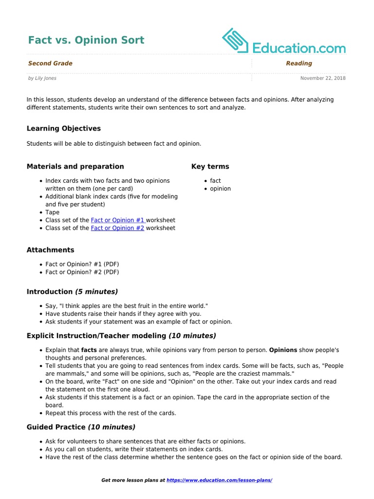 Fact or Opinion | Lesson Plan | Education.com This lesson can be used as a pre-lesson for the Fact or Opinion: Part 1 lesson plan. Objectives Academic Students will be able to identify facts and opinions. Language Students will be able to find facts and opinions in a nonfiction text. Students will be able to use new vocabulary words using sentence frames. Introduction (2 minutes) Fact and Opinion, Free PDF Download - Learn Bright Our Fact and Opinion lesson plan teaches students the difference between a fact and an opinion and why it is important to be able to identify a fact vs. an opinion. Students practice writing their own facts and opinions as well. Sign Up to Download Categories: Downloadable, Reading, VideoTags: 1st Grade, 2nd Grade, 3rd Grade Description