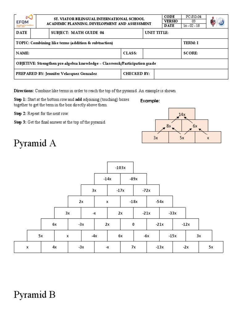 Worksheet on Combining Like Terms - math-only-math.com 1. Find the sum of combining like terms: 2. Subtract from: Now we will practice the word problems on addition and subtraction combining like terms provided in the worksheet on combining like terms. 3. To the sum of 2x - 3y - 2z and 2y - x + 7z at the sum of x - 4z + 7y and z - 6y. 4. Algebra Freebie Like Terms Teaching Resources | TPT A key skill for Algebra is simplifying expressions. Help students review the simplifying expressions with this worksheet on combining like terms. There are 8 questions that cover combining like terms and distributive property. Algebra 2 Worksheets | Basics for Algebra 2 Worksheets - Math-Aids.Com Combining Like Terms Worksheets This Algebra 2 - Basics Worksheets will create algebraic statements for the student to simplify and combine like terms. You may select from 2, 3, or 4 terms with addition, subtraction, and multiplication. These Basics Worksheets are a good resource for students in the 8th Grade through the 12th Grade. Combining Like Terms - ChiliMath Step 1: Combine the. x. x x -variables within the inner parenthesis. Step 2: Distribute the constant. 2. 2 2 into the terms of the inner parenthesis. Step 3: Combine like terms as much as possible inside the square bracket symbol. Identify like terms first before combining. Step 4: Distribute the constant.