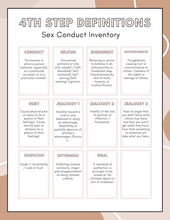 PDF Fourth Step Guide - Alcoholics Anonymous Cleveland There are four sections to the Fourth Step, each with a corresponding worksheet you may fill out. The basic process is to read the section, then fill out the worksheet. Feel free to make copies of a worksheet if more space is needed. The four sections to your personal inventory are: 1. Resentments. 2. Fears 3. Sex Conduct 4. Harm Done to Others ... Big Book Study Guide Downloads - Upper Room Comm Fourth Step Inventory Guide Free Big Book Study 4th Step Worksheets The 4th Step guide used by Joe & Charlie in the Joe & Charlie Big Book Study MP3 and CD sets Big Book Study Guides Download PAGE 1 PDF Download PAGE 2 PDF Download PAGE 3 PDF Download PAGE 4 PDF Download PAGE 5 PDF Download PAGE 6 PDF Download PAGE 7 PDF Download PAGE 8 PDF 4th Step Workshop Info Packet FEAR INVENTORY PROMPT SHEET. Here is a list of fears that may be helpful in your fear inventory. Feel free to add to the lists if you need to. Fear Of God.