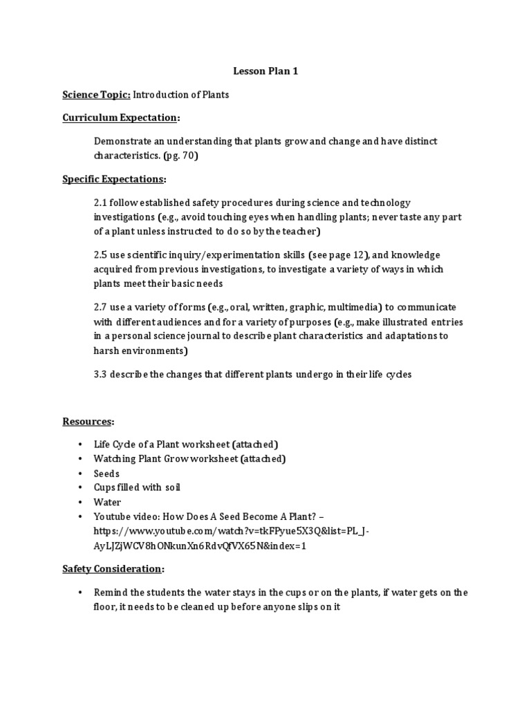 Plants - Science Lesson Plan (GR 1) - Education World They first grow roots, then a stem and then the leaves grow. This usually happens once a year. The seeds end up on the ground at the end of the summer or in the ... 1st Grade Lesson Plan: Plant Life Cycle - doTERRA the plant life cycle “What You Discovered” worksheet revised for 1st grade classroom use. Procedure: 1. Start with a basic class discussion about plants and ... Parts of a Plant | Lesson Plan | Education.com Draw a picture of a plant on the board. Be sure to include roots, a stem, a flower, and leaves in your drawing. · Ask your students to tell you what you've just ...