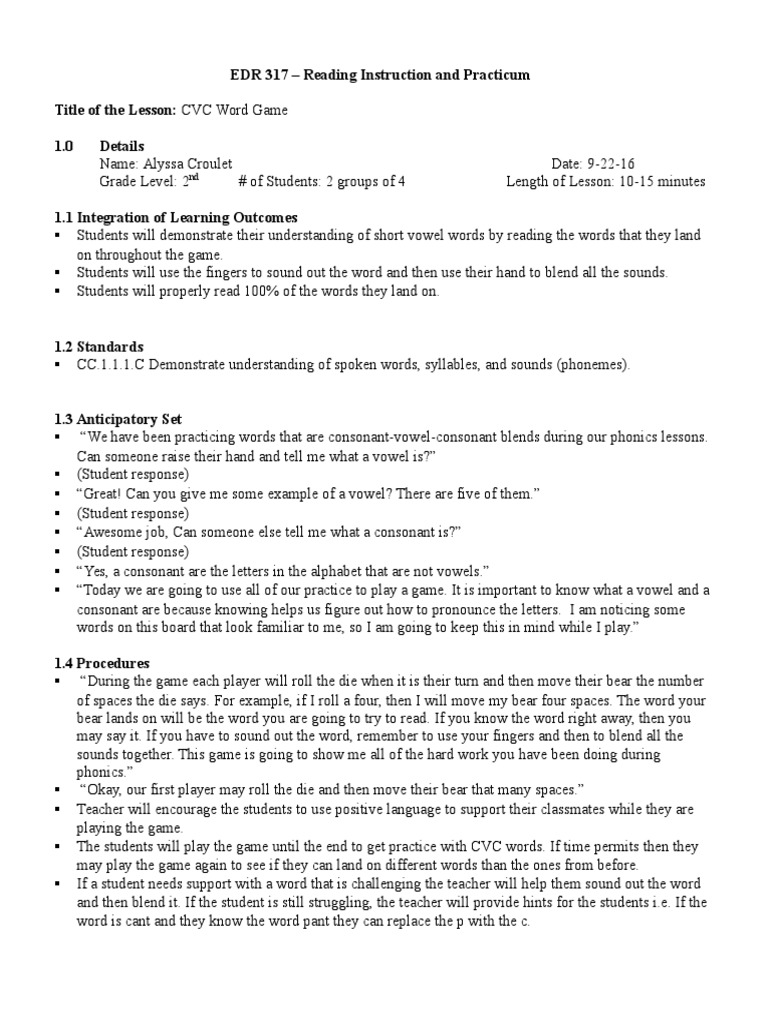 mrsvschickadees.com › 2019/08/21 › teaching-cvc-wordsTeaching CVC Words in 7 Simple Steps! - Mrs V's Chickadees Aug 21, 2019 · To start teaching CVC words, it is important to know whether or not your class is ready. Letter sound identification is a must. If you have students who are still struggling with letter sounds, they are not ready to begin segmenting and blending words. You should focus on the mastery of letter sounds before moving on. Teaching CVC Words in Kindergarten, First, and Second Grade If you want to review other mistakes that are commonly made when teaching phonics before you try this lesson out in your classroom, check out my video here: 3 Mistakes Teachers Make when Teaching Phonics. Step 3: Decoding CVC words. Students had a quick warm-up, then they were able to segment some sounds to practice phonemic awareness. › MaddieWinsor › cvc-words-lesson-planCvc words lesson plan - SlideShare Jan 12, 2017 · Cvc words lesson plan 1. CVC Words lesson Plan By Maddie Winsor 2. CVC Lesson Target Audience ● Lesson is for students in grade 1 ● Lesson is for English Language Arts, specifically... 3. Intro to CVC To begin I would explain what a CVC was using the CVC smartboard lesson. I could also explain ...