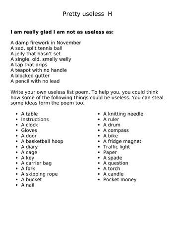 How to Write a List Poem: A Step by Step Guide Fill free to add elements to your list poem that are not discussed here. Let your imagination and your creativity take front and center as you write. Step 1: Choose a topic This is step one of a lot of my poem how-tos because having a topic will help focus your writing. How To Create A Poem Guides | Teaching Resources pdf, 2.13 MB. pdf, 3.16 MB. We asked several poets the same questions on how to create a poem, which was inspired by feedback from a teacher survey we ran, where lots of teachers told us their pupils struggle to know where to start writing a poem. The purpose of these guides is to show how each poet creates a poem, they are all different and ... › list-poemsList Poems - Institute for Writers Apr 14, 2020 · Start by making a list of subjects you know or wonder about, something as basic as a car or your favorite season, or all the places you’ve traveled to by train, a list of your dreams or nightmares, and then choose one for your first list poem. › activity › articleWrite a List Poem | Activity | Education.com Some of the best poems are simply lists of things, so if you can make a list, you can write a poem! Inspire your child to improve their writing skills, develop their vocabulary, and channel their inner poet with a list poem, a poem in which every line is one item in a list.