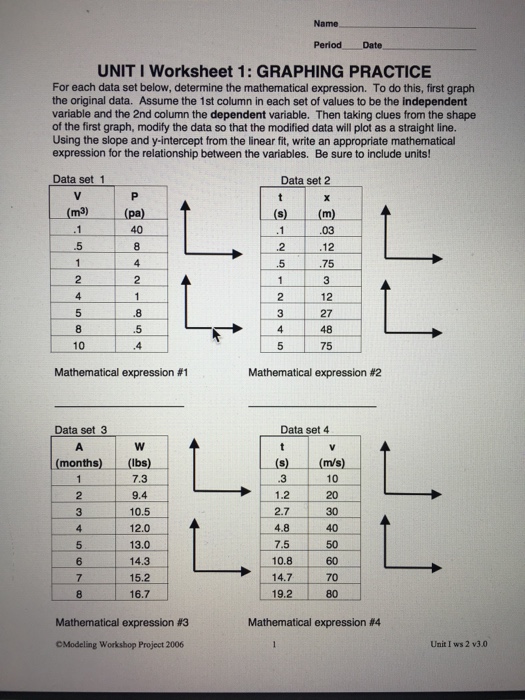 1680 - Name Date Pd UNIT I Worksheet 1: GRAPHING PRACTICE... 'Modeling Workshop Project 2002 1 Unit I Teacher Notes v2.0Name Date Pd UNIT I Worksheet 1: GRAPHING PRACTICE For each data set below, determine the mathematical expression. To do this, first graph the original data. Assume the 1st column in each set of values to be theindependent variable and the 2nd column thedependent variable.