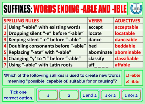 Commonly Confused Suffixes: -able vs. -ible - The Free Dictionary The suffixes “-able” and “-ible” are both used to form adjectives meaning “possible, capable of, suitable for, or causing.” Of the two, “-able” is much more common: it is what’s known as a “living” or “productive” suffix, meaning that it is still being used to create new words. ible suffix - Definition, pictures, pronunciation and usage notes that can or must be. audible; defensible. Definitions on the go. Look up any word in the dictionary offline, anytime, anywhere with the Oxford Advanced ... 26 Common Suffixes in English (With Examples) - ThoughtCo Feb 14, 2020 · A suffix is a letter or a group of letters attached to the end of a word to form a new word or to change the grammatical function (or part of speech) of the word. For example, the verb read is made into the noun reader by adding the suffix -er. Similarly, read is made into the adjective readable by adding the suffix -able . -ible - definition of -ible by The Free Dictionary a•ble (ˈeɪ bəl) adj. a•bler, a•blest. 1. having the necessary power, skill, resources, or qualifications to do something: able to read music; not able to vote. 2. having or showing unusual talent, intelligence, skill, or knowledge: an able leader.