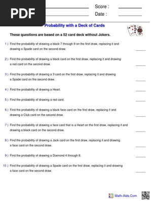 PDF Score : Teacher : Date - Ozark School District Math-Aids.Com Probability with a Deck of Cards These questions are based on a 52 card deck without Jokers. 1 ) Find the probability of drawing a face card that is a Diamond. ______ 2 ) Find the probability of drawing a face card that is black. ______ 3 ) Find the probability of drawing a Spade. ______ 4 ) Find the probability of drawing a 5.