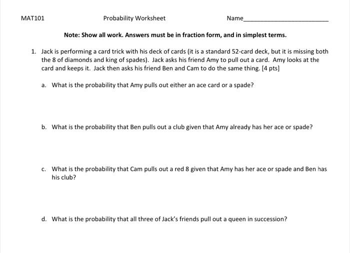Probability with a deck of cards worksheet answers